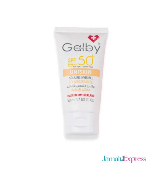 UNISKIN Crème Solaire Éclaircissante SPF50+ de GALBY DERMATECH, spécialement formulée pour les peaux normales à sensibles, combine une protection solaire à large spectre avec des propriétés unifiantes et clarifiantes pour un teint homogène et lumineux. Enrichie en agents hydratants et éclaircissants, UNISKIN SPF 50+ Invisible aide à atténuer les taches pigmentaires tout en offrant un fini mat et lumineux. Sa texture légère et hydratante laisse votre peau douce et protégée tout au long de la journée.